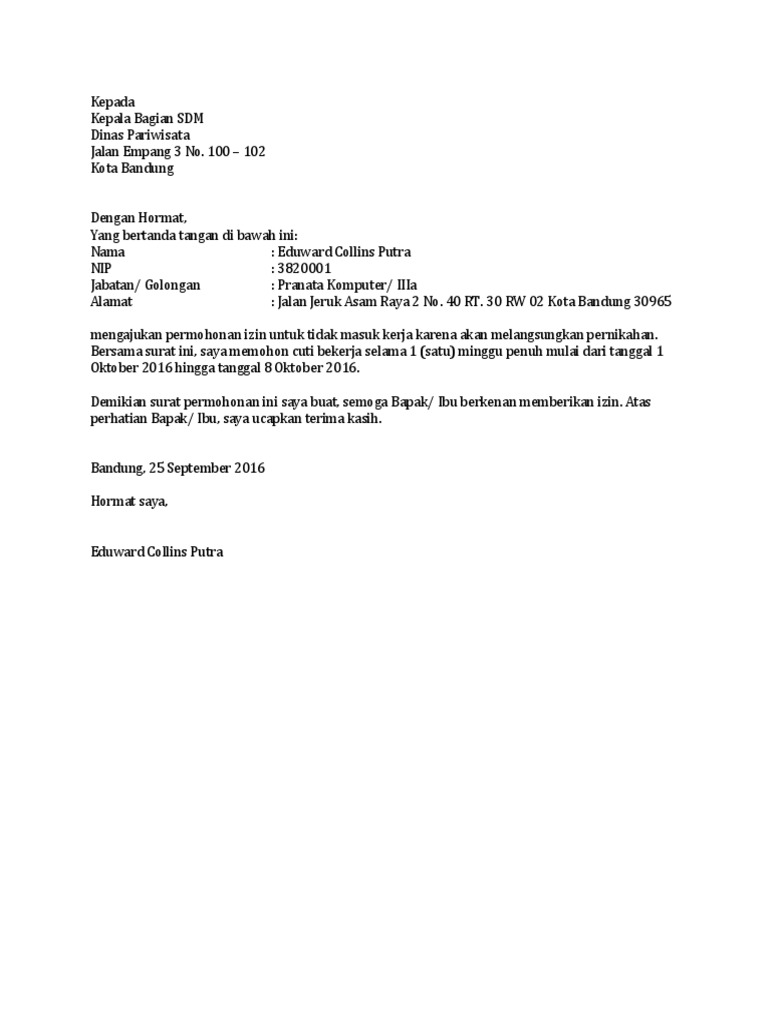 Pengajuan izin menikah dan cuti yth. Tenggarong, nopember 2017 kepada perihal : Yth, kepala kua kelurahan jatimulyo kecamatan lowokwaru jl. Contoh surat izin adalah sebuah surat yang dibuat dengan tujuan untuk meminta izin kepada penerima bahwa sang pengirim memiliki hajat / acara tertentu sehingga tidak bisa hadir atau. Cara membuat surat izin cuti menikah yang benar. Dalam surat disebutkan secara lengkap data diri pemohon serta waktu cuti. 1.1 cara menulis surat izin betul dan baik 1.22 contoh surat izin tidak masuk kerja atau kuliah karena menikah Cara kirim dokumen surat izin menikah di kedutaan bisa melalui : Baik itu surat izin kuliah, surat izin kerja, surat izin tidak masuk sekolah dll. Surat izin cuti menikah diajukan oleh yang bersangkutan dan ditujukan kepada pimpinan perusahaan atau instansi. Lantas, apa saja yang perlu anda beritahukan pada. Dengan ini saya mengajukan izin cuti menikah terhitung mulai tanggal 26 sampai dengan 30 september 2004. Jika acara pernikahanmu dilakukan satu atau dua hari.